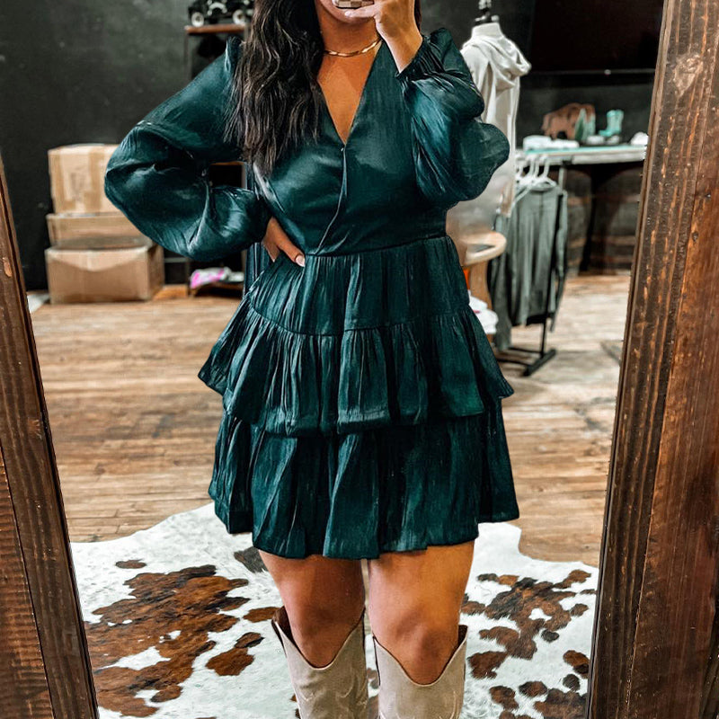 Stay on trend this season in our new pretty, v neck dress. We especially love the solid color fabric and think this piece will be a new favorite in your closet!