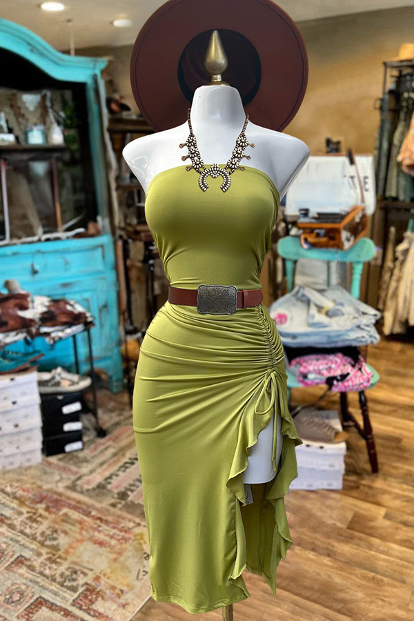 Solid Color Strapless Drawstring Ruffled Midi Dress