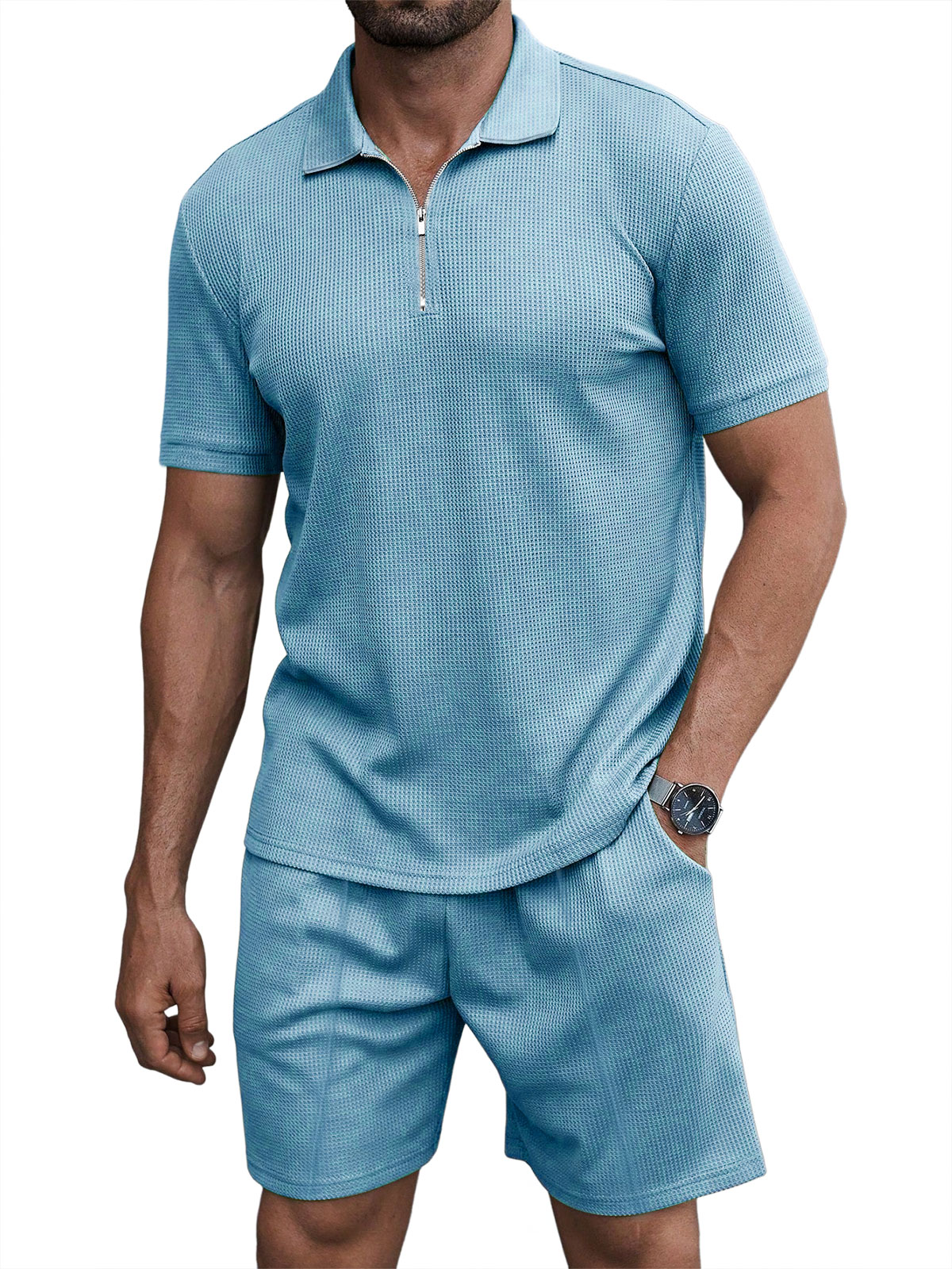 Men's Casual Waffle Zipper Short Sleeve Polo Suit
