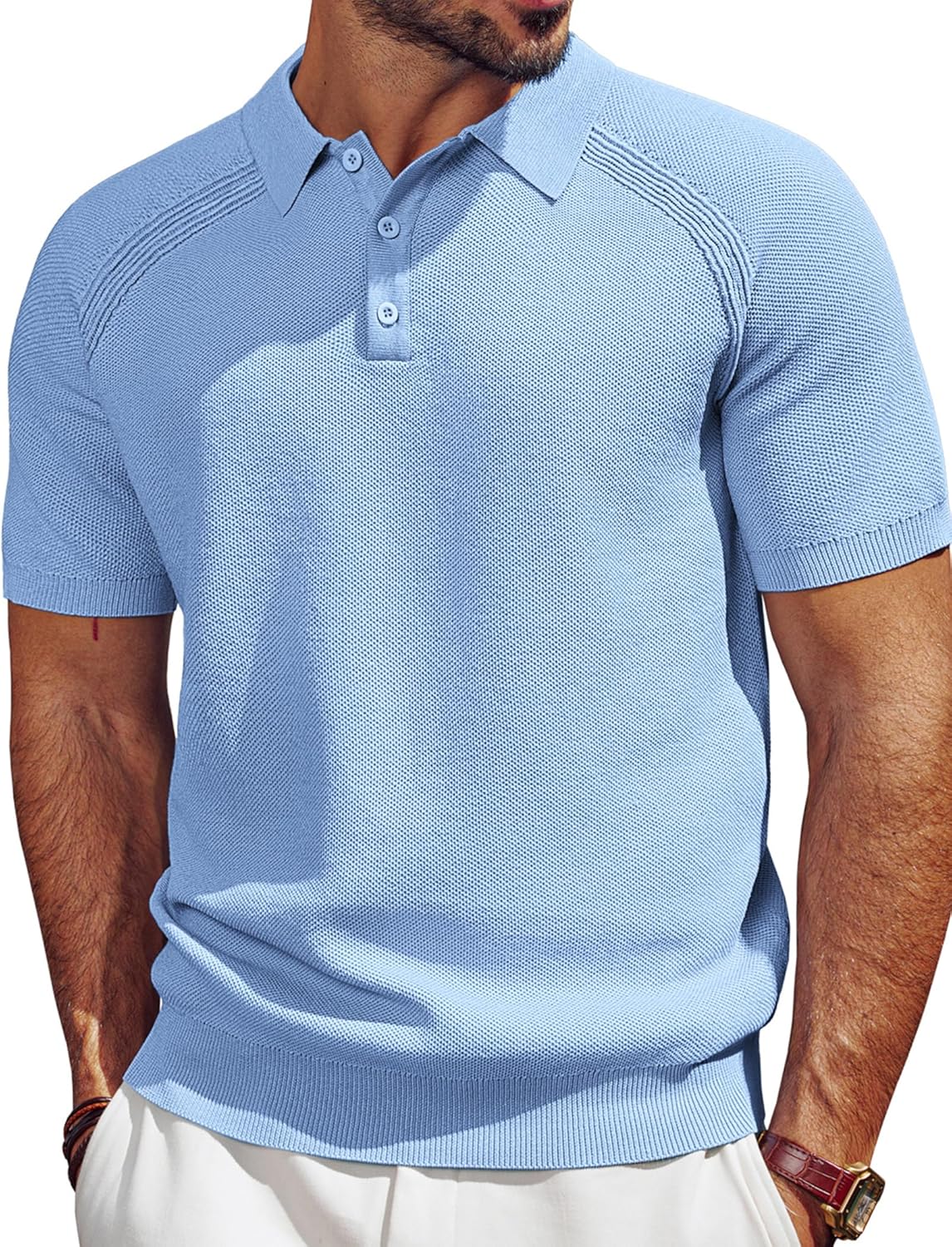 Men's Polo Shirt Short Sleeve Textured Knit Button Shirts Raglan Sleeve Casual Golf Shirt