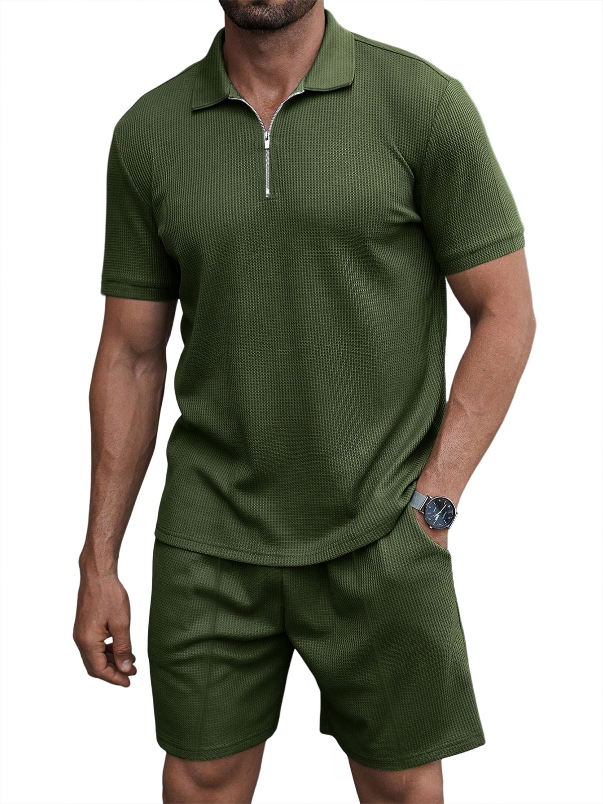 Men's Casual Waffle Zipper Short Sleeve Polo Suit